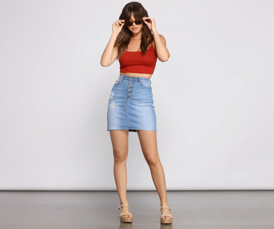 Button up into this adorable denim mini skirt to make your 'fit all the more trendy! With its high waist and raw cut hem, the skirt is a must-have for grabbing lunch with your squad. Pair with some wedges and tortoiseshell shades for that laid back, yet chic look.