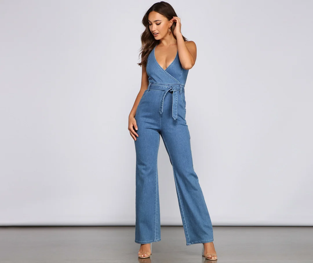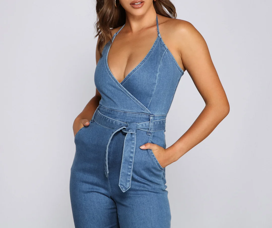 Showcase your fashion diva side in this fab denim jumpsuit! It features a sleeveless V-neckline with a wrap-front design, halter spaghetti straps, a high waist with a tie-front belt, a form-hugging silhouette, and pant legs with a flared hem. Style this jumpsuit with clear heels.