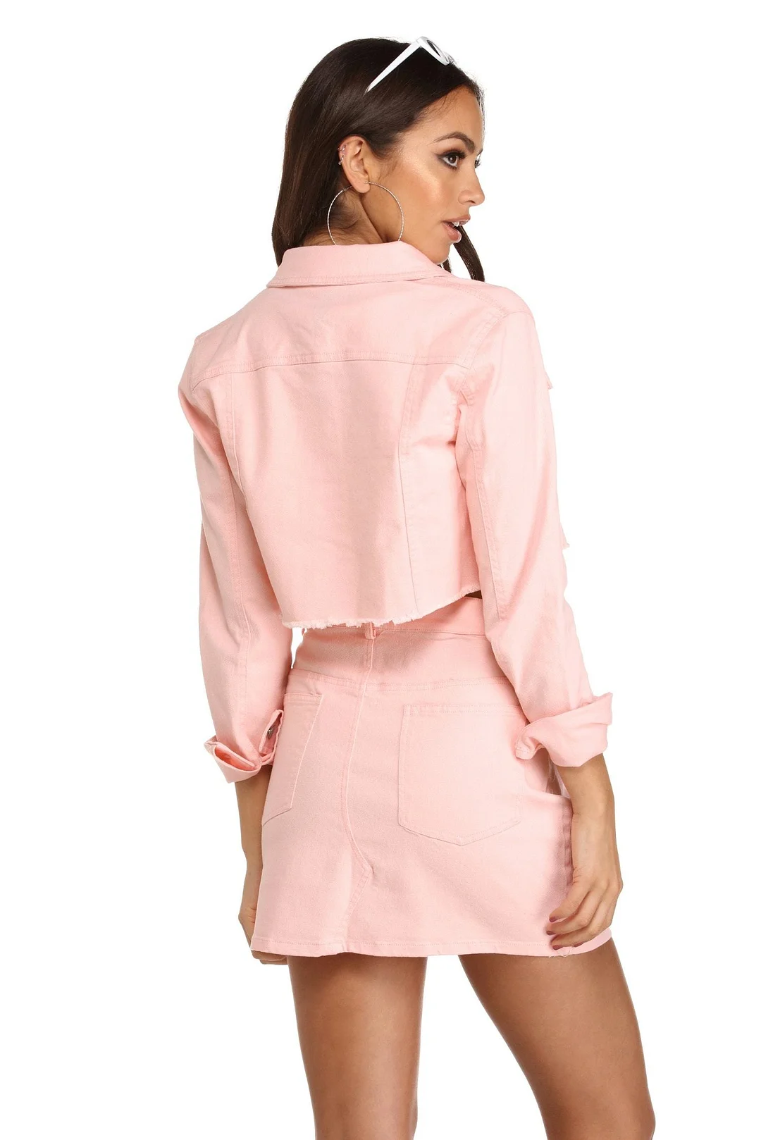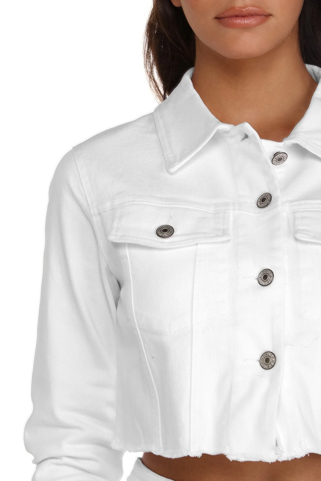 Dream up the perfect look for your summer adventures in this staple piece! This cropped jacket features a collar, a multi button down front, two small chest pockets with button closure, long sleeves and a lightly frayed hem. Jacket is composed of a white denim fabric that offers a relaxed fit with a moderate stretch. Be sure to pick up the matching skirt to complete your ensemble.