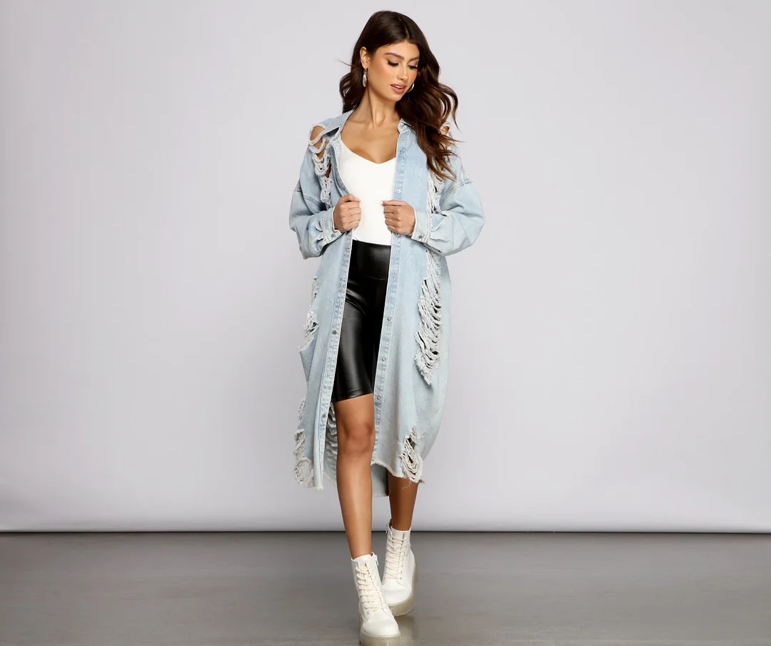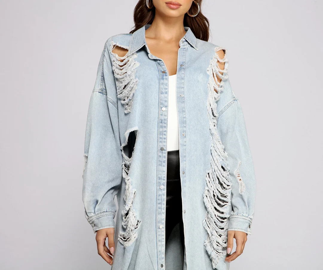 A casual staple gets elevated with a longer cut and statement-making details. Jacket has a relaxed fit and features a standard collar, snap-button closure at front, long cuffed sleeves, strategic distressed detailing at front and back, and a rounded frayed hem. Jacket is made from a cotton blend with little to no stretch.