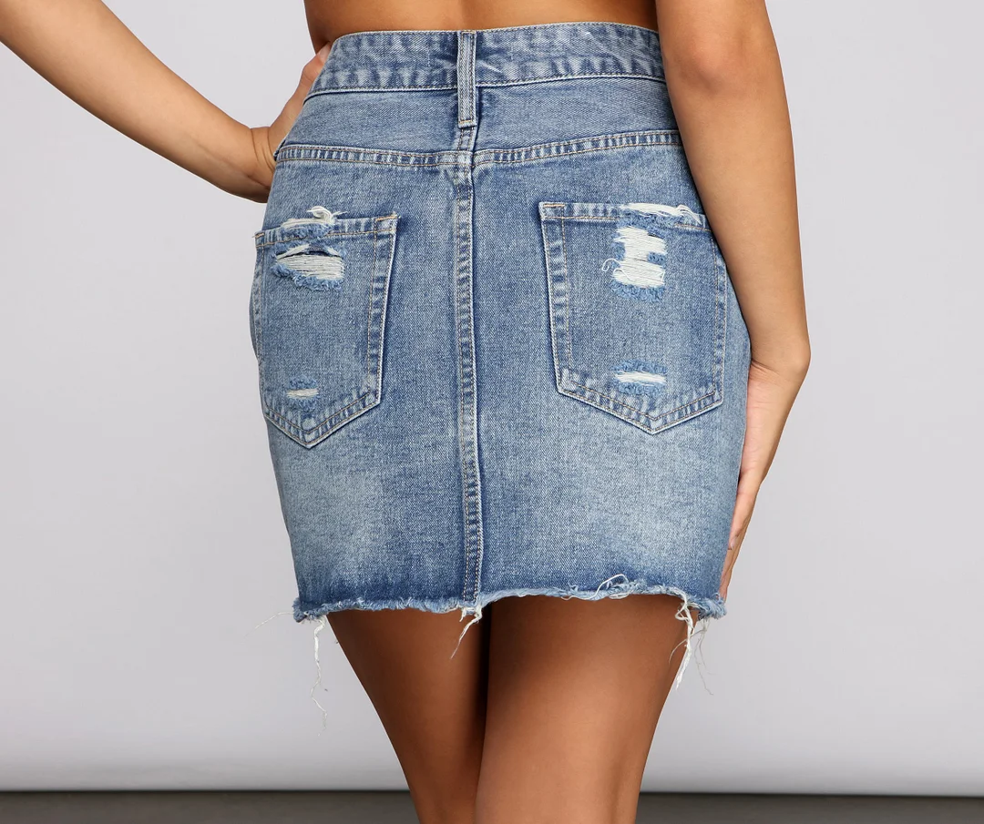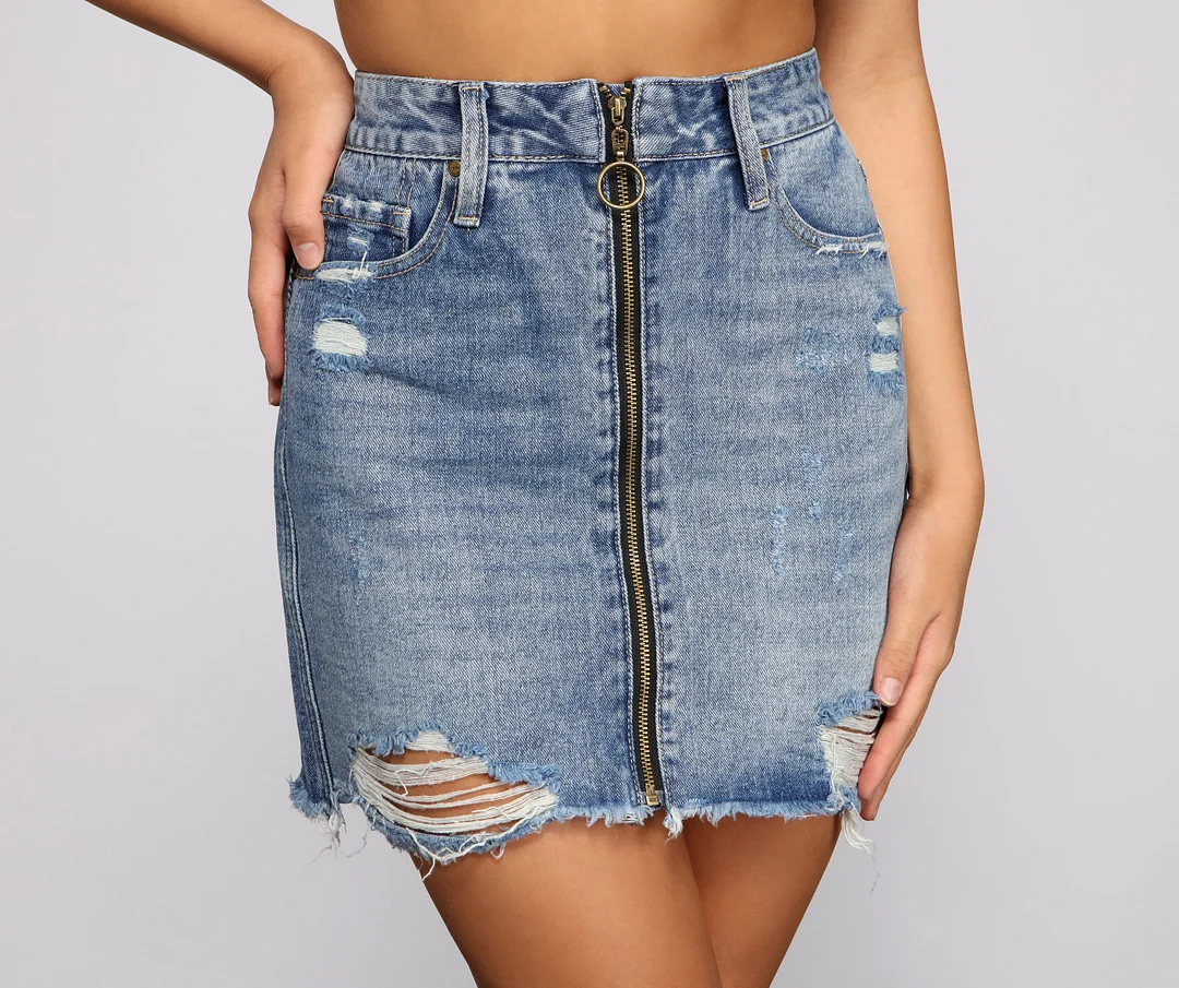 Bring the drama to your look with a denim skirt that slays! The skirt features a high-rise waist, a zippered center front, a traditional five-pocket with belt loop design, heavy distressing, and a mini-length silhouette. Complete look with a crop top and wedges.
