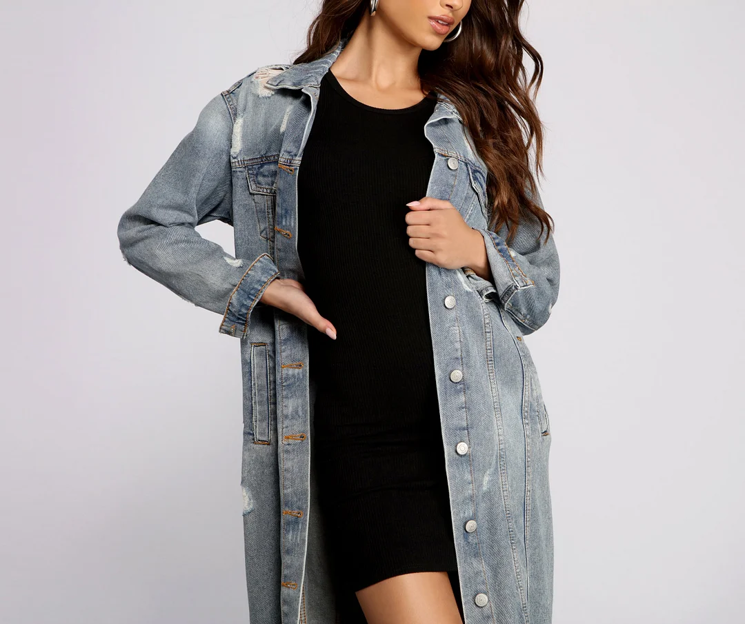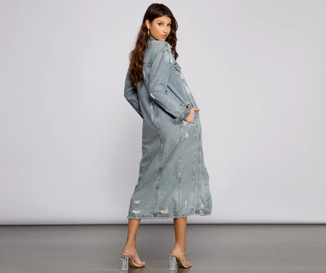 Go for fray to complete your ensemble! This must have denim jacket features a flat collar, two small chest pockets, a multi button down front, long rolled sleeves, side pockets, heavy distressed detailing throughout and a frayed hemline. Jacket is composed of a light wash unlined denim fabric that offers a relaxed fit with minimal stretch.