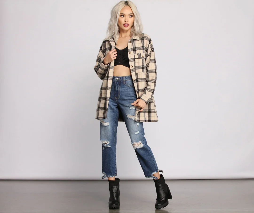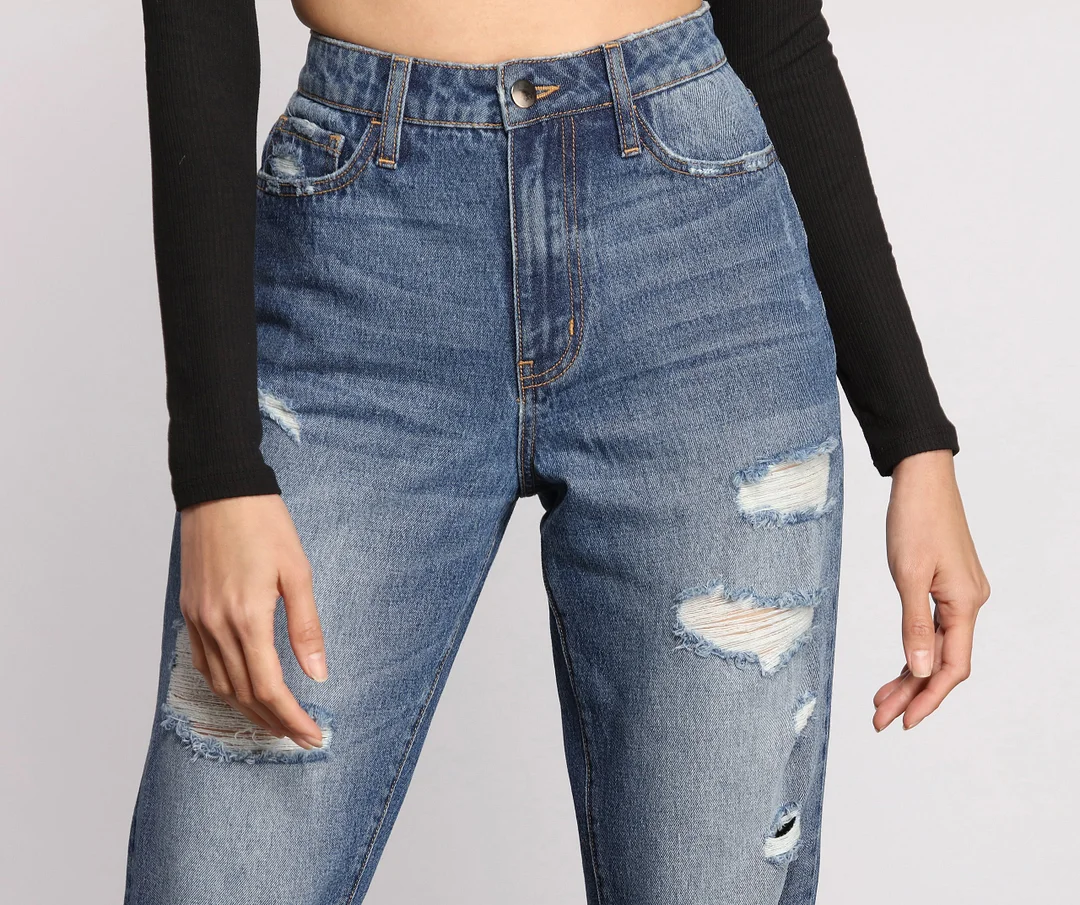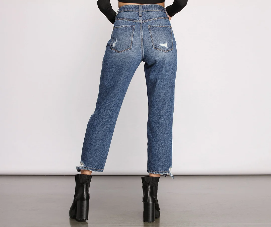 Keep on trend with mom jeans with standout deets! The jeans feature a high rise waist, heavy destruction throughout, and a cropped hem. Complete your look with a cute crop top!