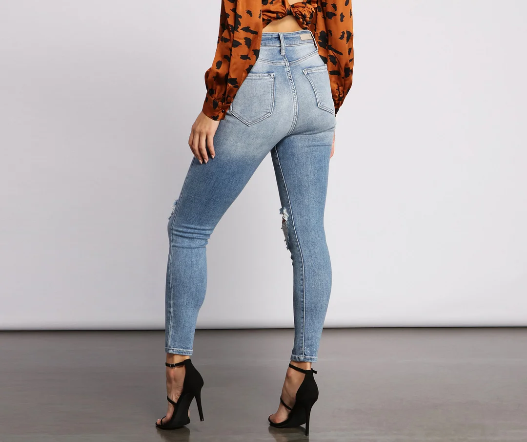 Get a trendy everyday look in these high rise destructed skinny jeans! They feature a figure-flattering tapered fit with major distressed detailing down the front. Pair these jeans with a chic crop top and heeled booties for a go-to look to hang with your girls.