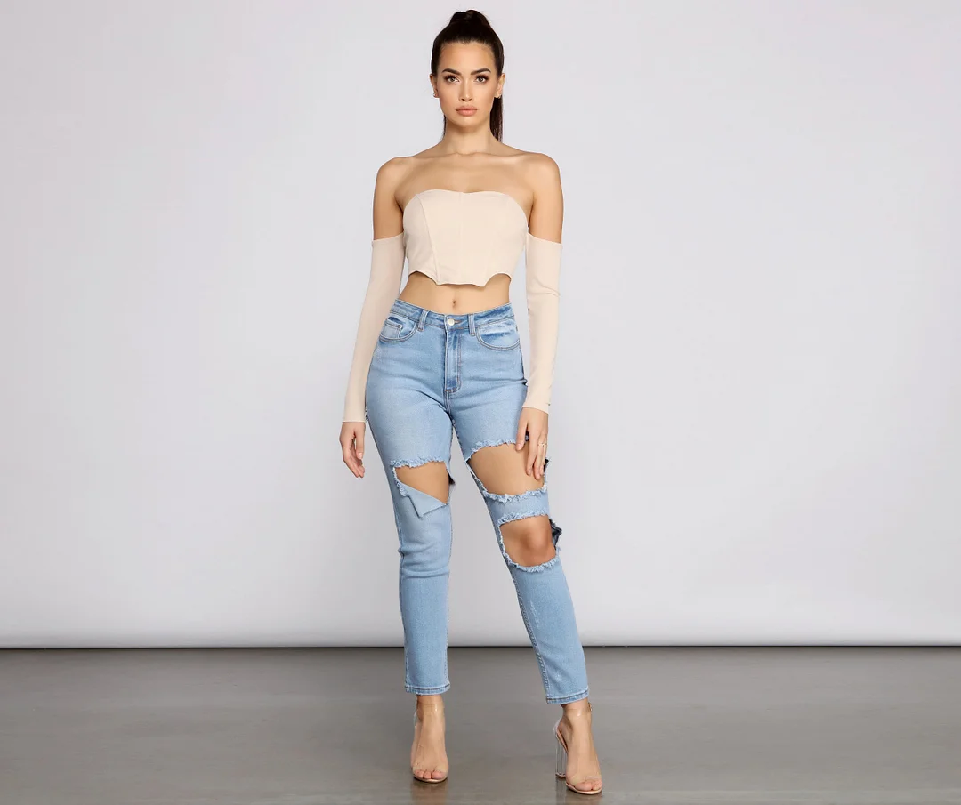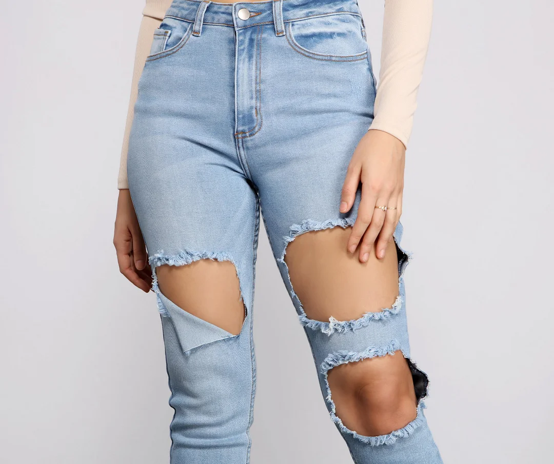 These trendy high waist cut out skinny jeans will amp up any casual look and make it even edgier! They feature a high rise waist, a traditional five-pocket and belt loop design, a front button and hidden zipper closure, dramatic front cut outs, and slits below the back pockets. The jeans are composed of a stretchy denim fabric and offer a form-hugging fit. Complete your outfit with a chic crop top and clear heels.
