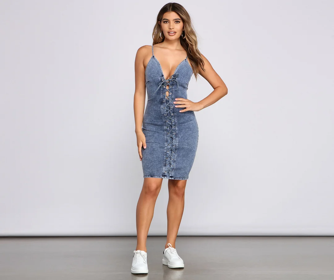 Lace up in this trendy denim dress to make a stylish statement! This dress features a sleeveless bodice, a plunging V neckline, adjustable narrow straps, a back zipper and hook and eye closure, a lace up front detail and a curve hugging silhouette. Dress is composed of a denim fabric with moderate stretch.
