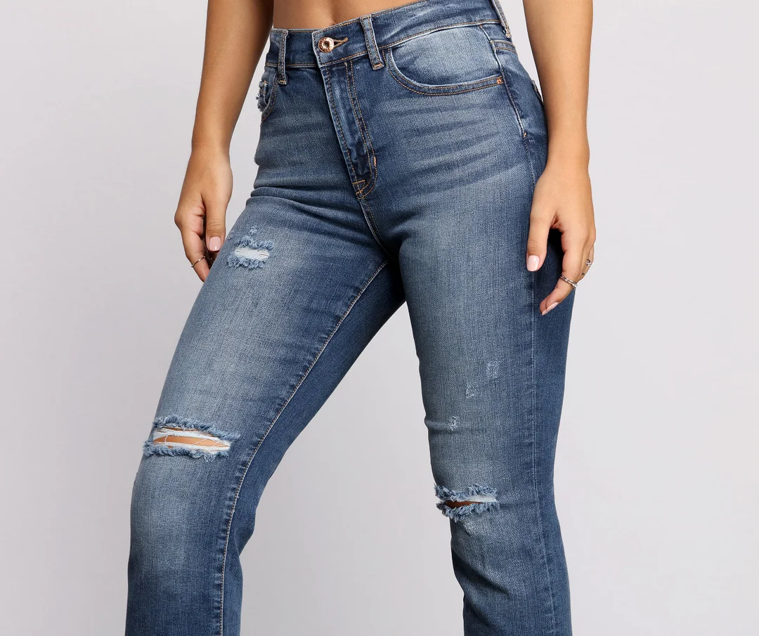 Elevate your denim outfits in jeans that take your look to the next level. The jeans feature a mid-rise fit, moderate destructed detailing, and a cropped hem. Complete your look with a bustier and door knocker earrings.
