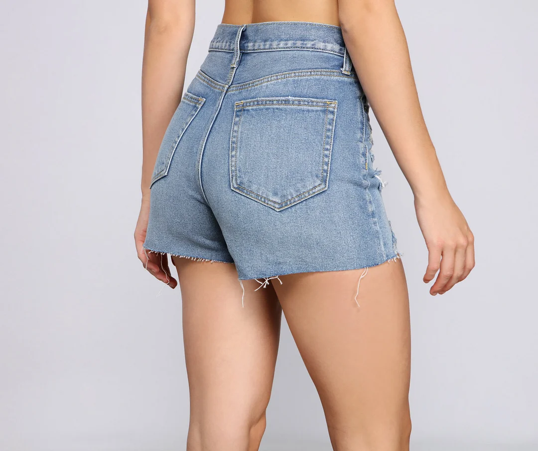 Take on the day with destructed shorts that bring the edge to your look! The mom-styled shorts feature a high-rise waist, a single-button with zipper closure, a traditional five-pocket with belt loop design, heavy destruction throughout, and a cutoff hem. Complete the look with a floral off-the-shoulder top.